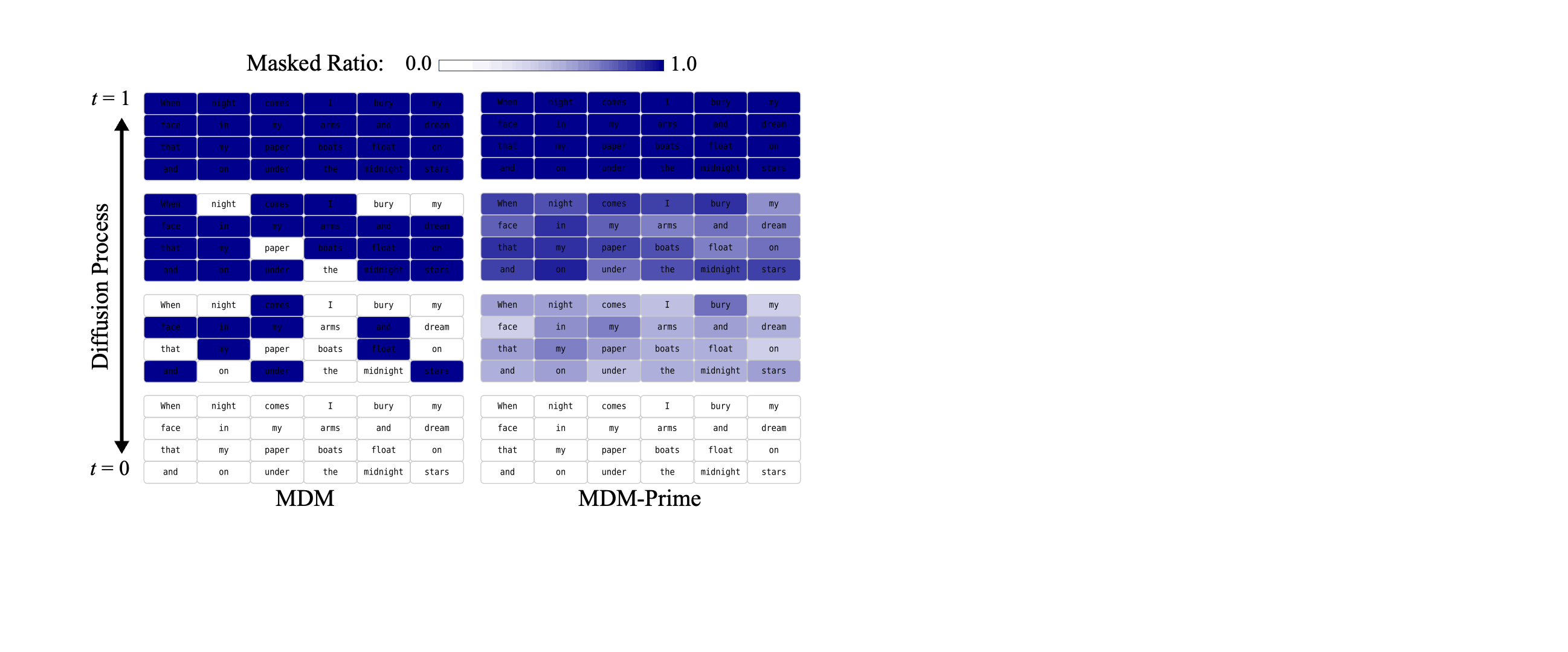 Figure 2. Overview of MDM, MDM-Prime, and the MDM-Prime-v2 enhancements. $\ell$ is the token granularity in $\ff_\ell$ and $V$ is the vocabulary size.
