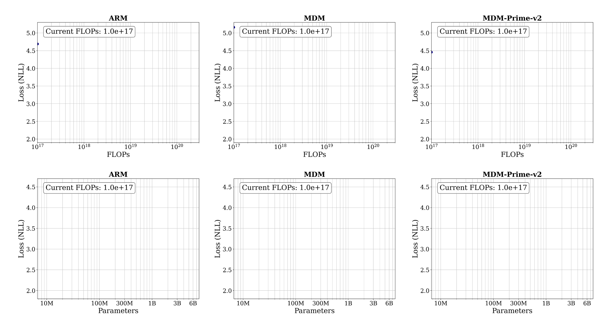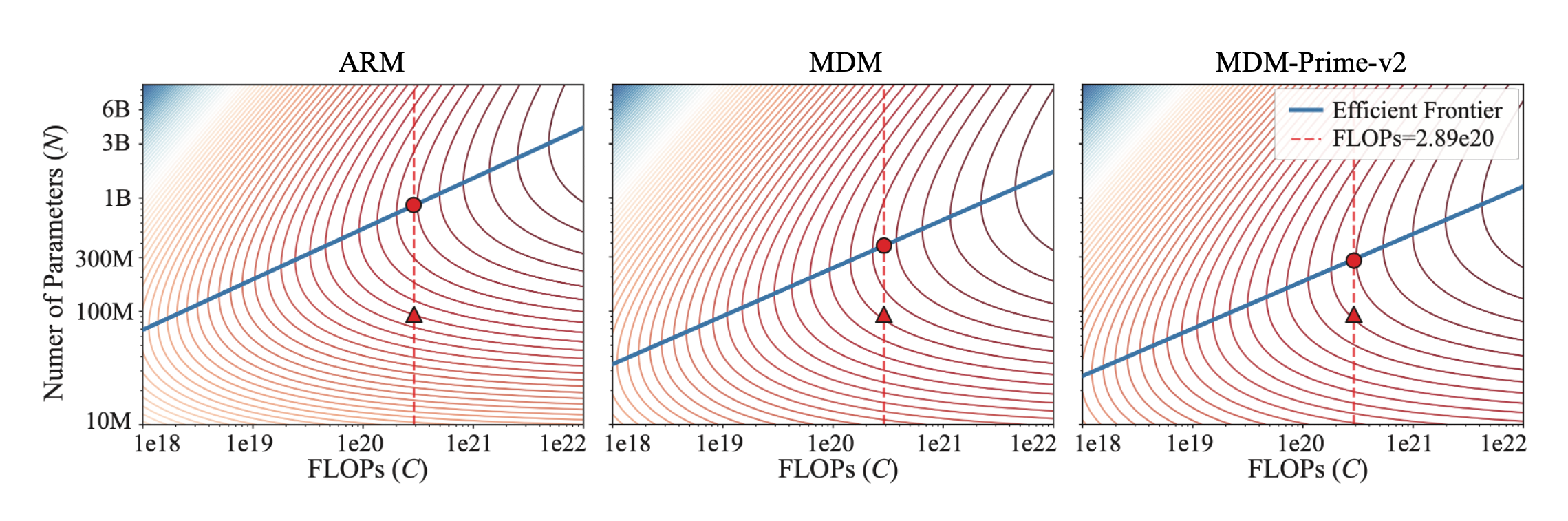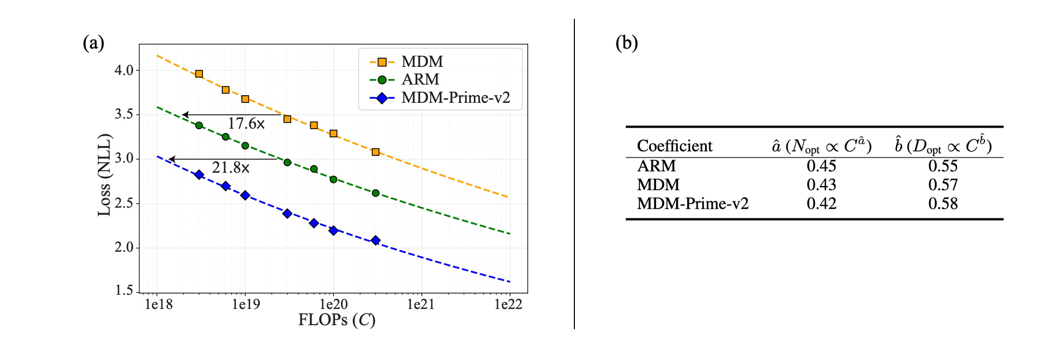 where $G = \left( \frac{\alpha A}{\beta B} \right)^{\frac{1}{\alpha+\beta}}$, $\hat{a} = \frac{\beta}{\alpha+\beta}$, and $\hat{b} = \frac{\alpha}{\alpha+\beta}$. As shown in Fig. 5 (b), ARM exhibits the largest $\hat{a}$ and the smallest $\hat{b}$, indicating that the compute-optimal configuration of ARM prioritizes increasing model capacity ($N$) over data volume ($D$). In contrast, MDM-Prime-v2 yields the smallest $\hat{a}$ and the largest $\hat{b}$, suggesting that its compute-optimal performance is driven more by increasing training tokens than by expanding model parameters. These coefficients determine the compute-optimal frontier lines (i.e., the blue straight lines) illustrated in Fig. 6.