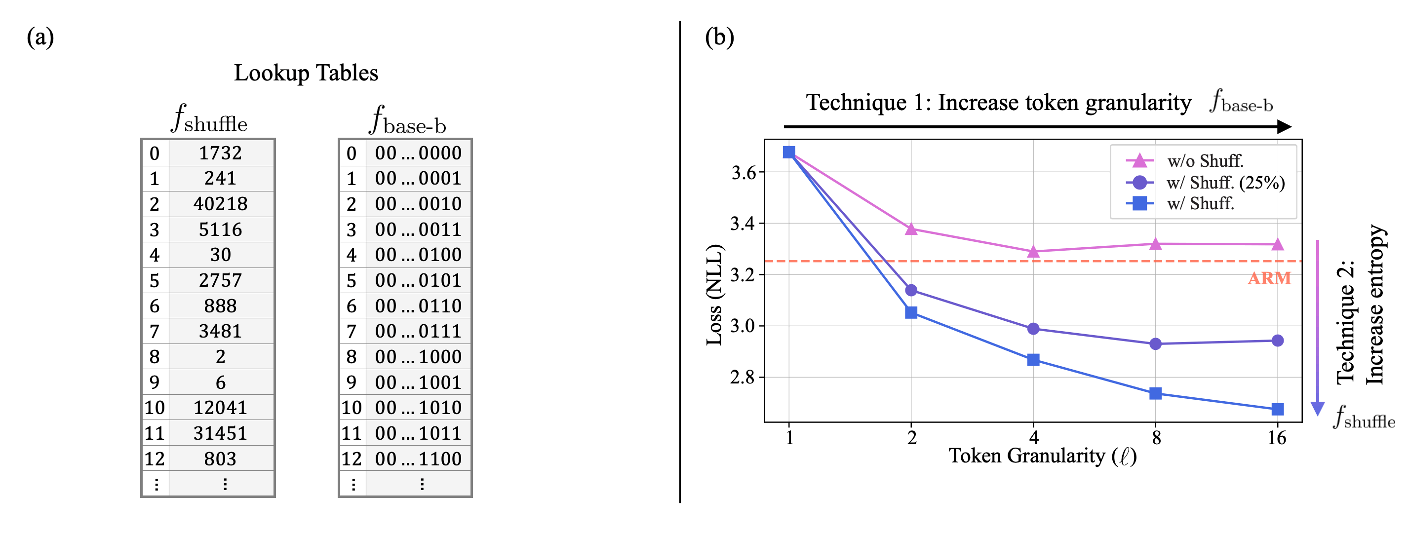 Figure 4. (a) The subtokenizer $\ff_\ell$ in MDM-Prime-v2 is implemented via two lookup tables. (b) The NLL of MDM ($\ell=1$) and MDM-Prime ($\ell>1$) under three setups: `w/o Shuff.,' `w/ Shuff. (25%)', and `w/ Shuff.' $\lceil\log_2 V\rceil=16$ represents the maximum of $\ell$.