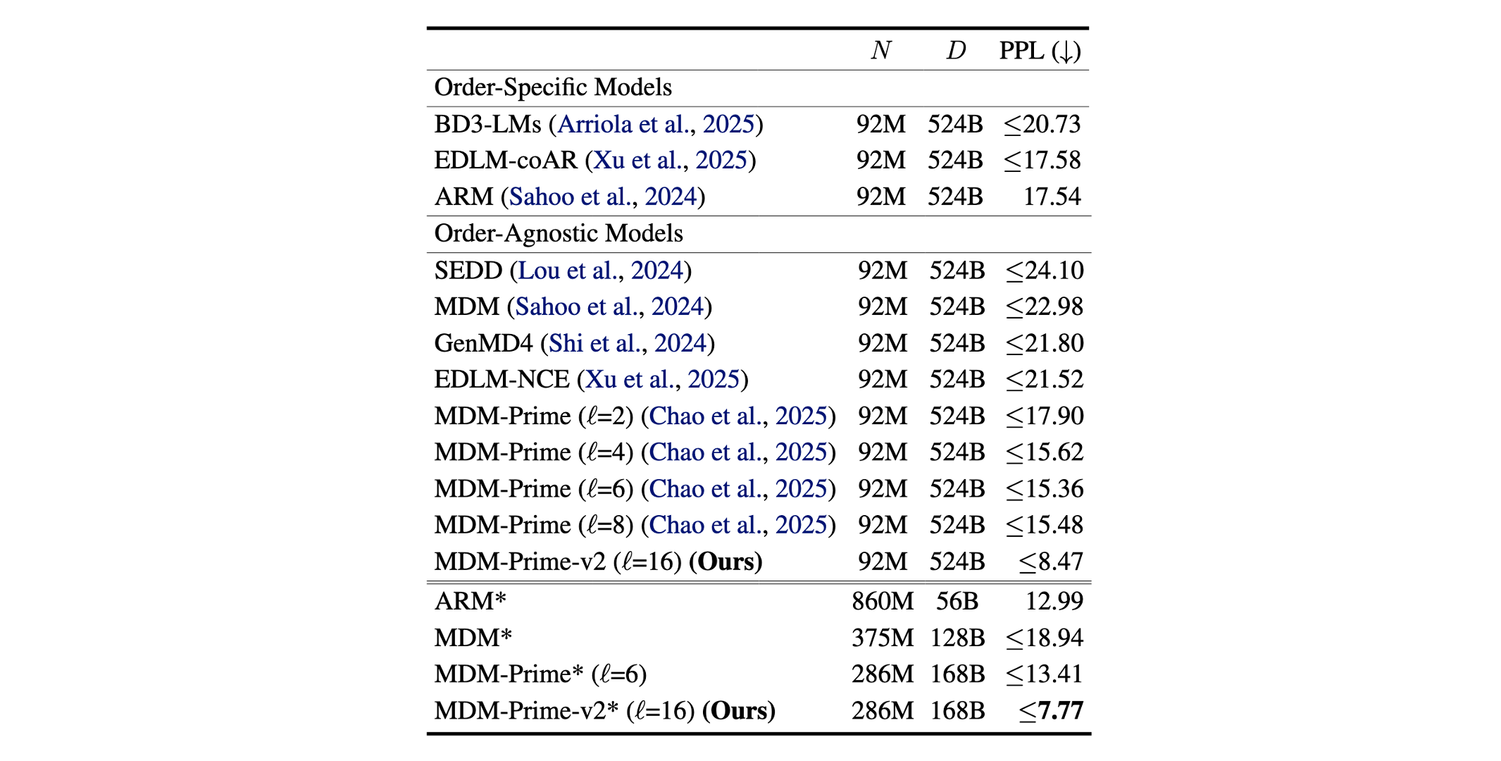 As demonstrated in Fig. 7, ARM's PPL improves significantly, from 17.54 to 12.99 (i.e., the difference between ARM and ARM* is 4.55), simply by adjusting $N$ and $D$. In addition, the baseline configuration ($N$=92M, $D$=524B), which uses excessively large $D$, appears to inadvertently favor the MDM-based approaches, evidenced by the relatively small gains observed in MDM, MDM-Prime, and MDM-Prime-v2 when shifting to the compute-optimal setup. By calibrating all models to the compute-optimal setup, we establish a consistent and fair criterion for performance evaluation. Under this configuration, MDM-Prime-v2* outperforms ARM*, MDM-Prime*, and MDM* by noticeable margins of 5.22, 5.64, and 11.17 PPL, respectively.