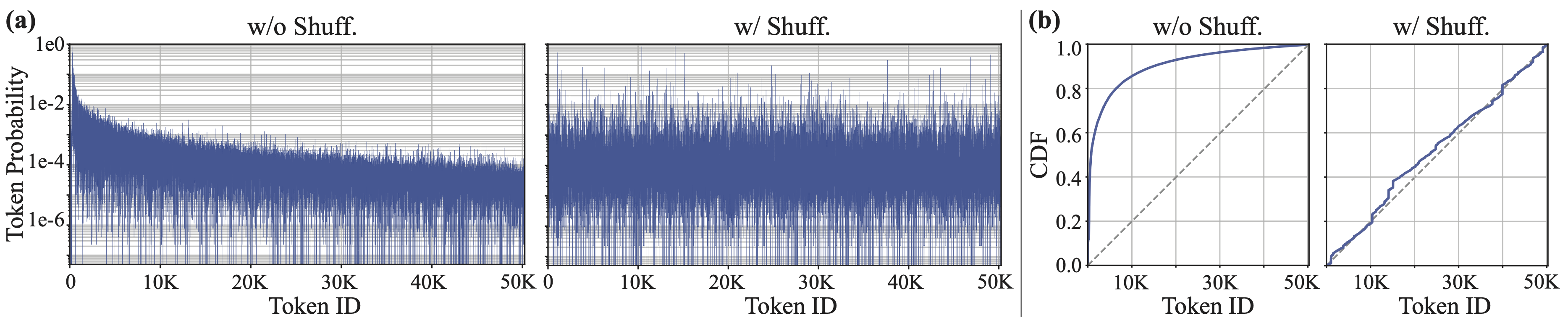 Figure 3. (a) Token probability and (b) cumulative distribution function (CDF) over token indices of the GPT-2 tokenizer evaluated on the C4 dataset. The left and right subplots of (a) and (b) show setups without and with index shuffling, respectively. The gray dashed line in (b) represents the CDF of a uniform token distribution.
