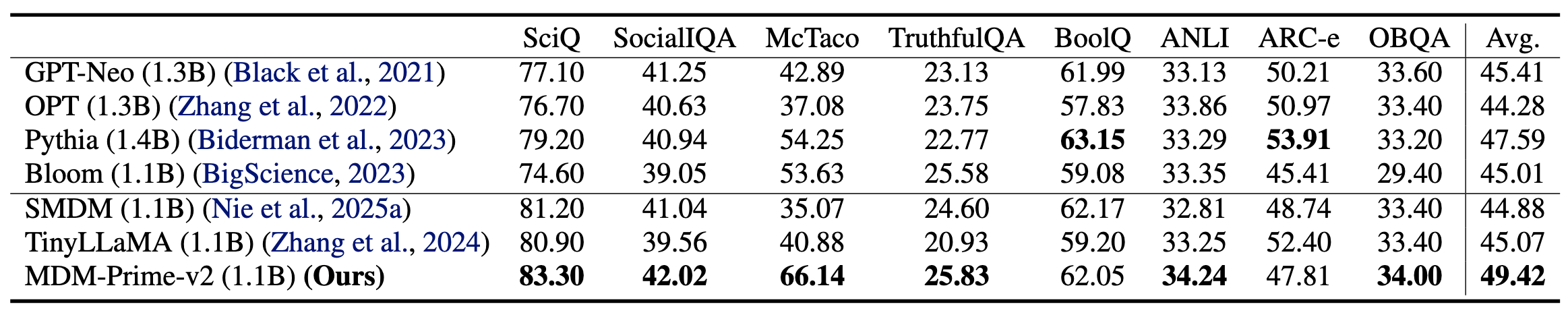 Fig. 8 presents the results. We compare our method against several pretrained ARM and MDM baselines of similar size: GPT-Neo (1.3B), OPT (1.3B), Pythia (1.4B), Bloom (1.1B), SMDM (1.1B), and TinyLLaMA (1.1B). MDM-Prime-v2 achieves the highest average accuracy across the tasks, outperforming these baselines on six of the eight tasks. In particular, our model demonstrates advantages in temporal reasoning and scientific question answering, delivering significant gains on the McTaco and SciQ benchmarks.